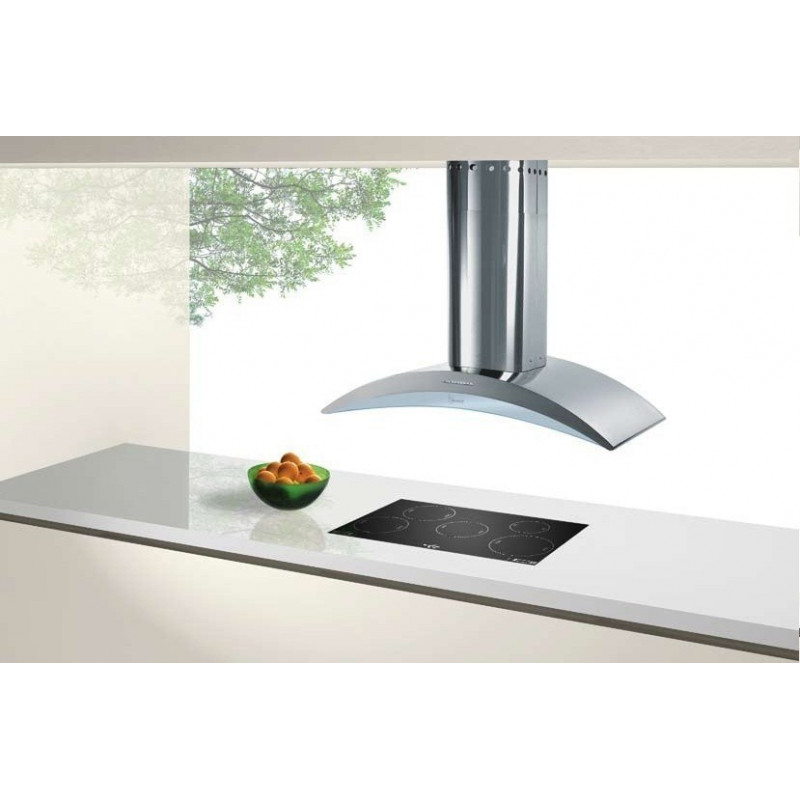 ELEA GLASS è la prestigiosa cappa a isola firmata Baraldi. Elegante e luminosa in questa versione inox satinato con camino a sx. L'ampio piano orizzontale da 146x60 cm., ad aspirazione perimetrale, è supportato da una pratica mensola in vetro che diventa punto d'appoggio.