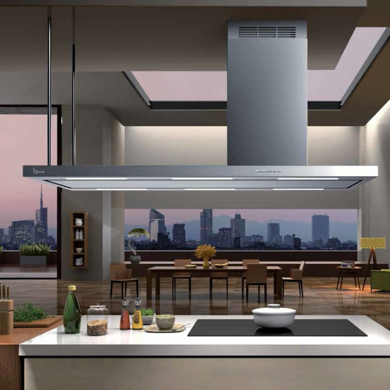 Mare di Falmec è una cappa dal design armonico ed elegante che si abbina a qualsiasi contesto d’arredo! Caratterizzata dall’utilizzo della tecnologia "E.ION SYSTEM", la cappa non necessita di tubi ed emissioni esterne: per installarla basta appenderla al soffitto!
