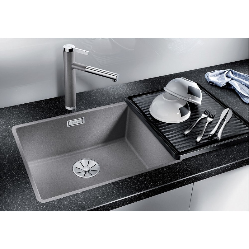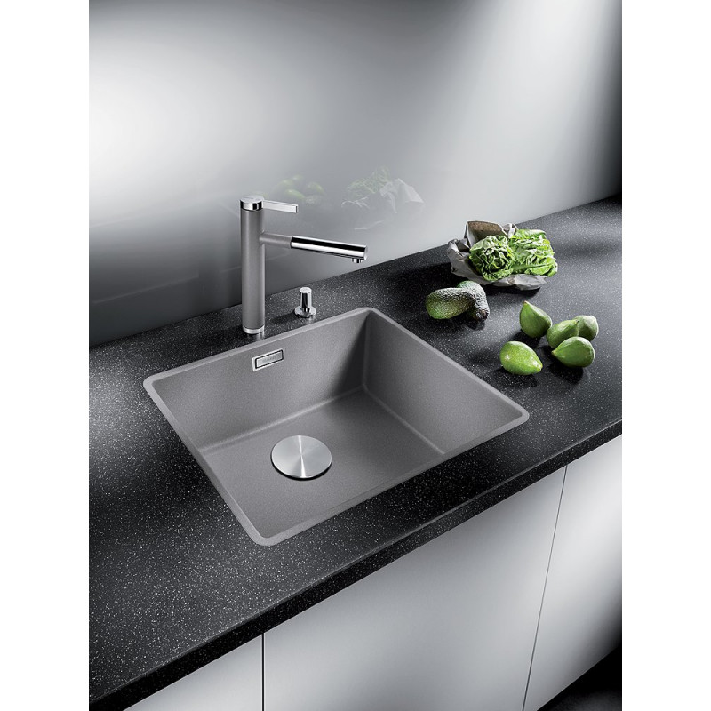 Il Lavello Blanco Sona 5 S in Silgranit® PuraDur® finitura grigio roccia è dotato di una vasca con piletta da 3½", sifone, tappo a cestello e gocciolatoio.