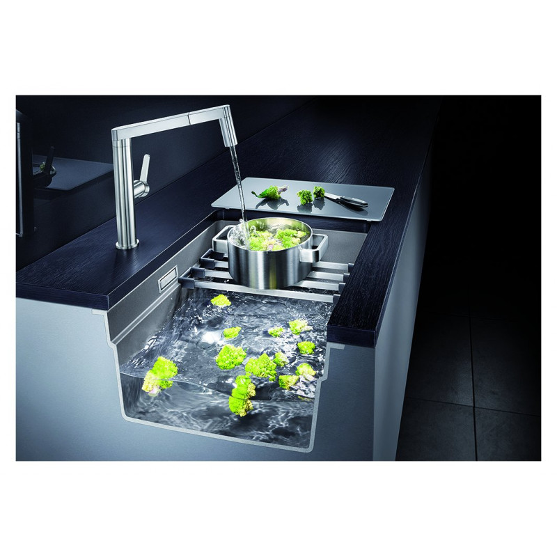 Il lavello Blanco sottotop Solis 340/180-U in inox è dotato di 1 vasca e 1/2 con profondità 185-125 mm, piletta da 3½", tappo a cestello InFino® e sifone. La fornitura di serie è di alta qualità con il troppopieno C-Overflow® e il sistema di scarico InFino®.