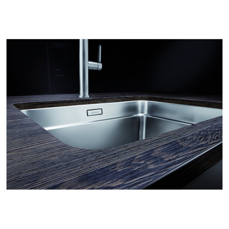 Il Lavello Blanco semifilo/filotop Claron 500-IF finitura Acciaio Inox 18/10 è dotato di una vasca con piletta da 3½", sifone e tappo a cestello InFino®.