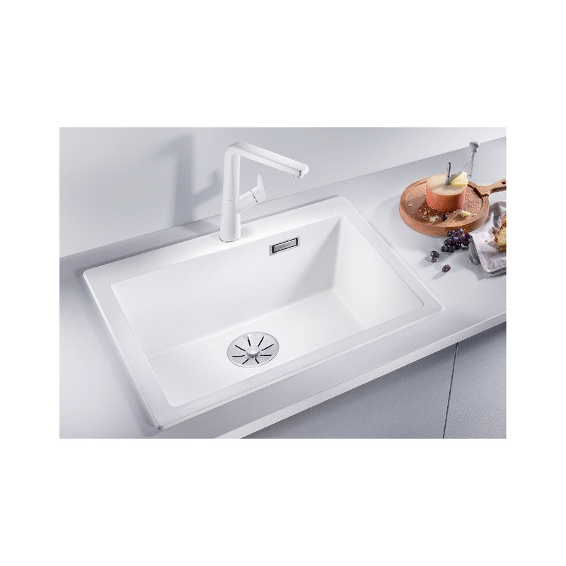 Il Lavello Blanco Dalago 5 in Silgranit® PuraDur® finitura bianco è dotato di una vasca con piletta da 3½", tappo a cestello, saltarello e sifone.