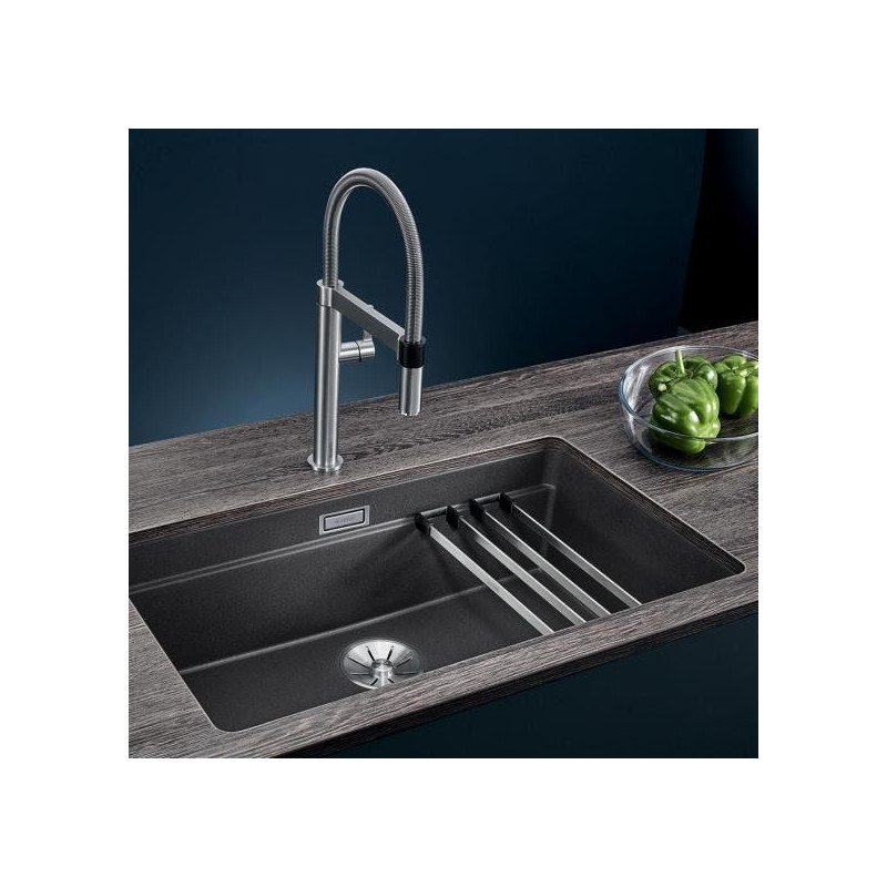Il Lavello Blanco Metra 5 S in Silgranit® PuraDur® finitura antracite è dotato di una vasca con piletta da 3½", sifone, tappo a cestello e gocciolatoio.