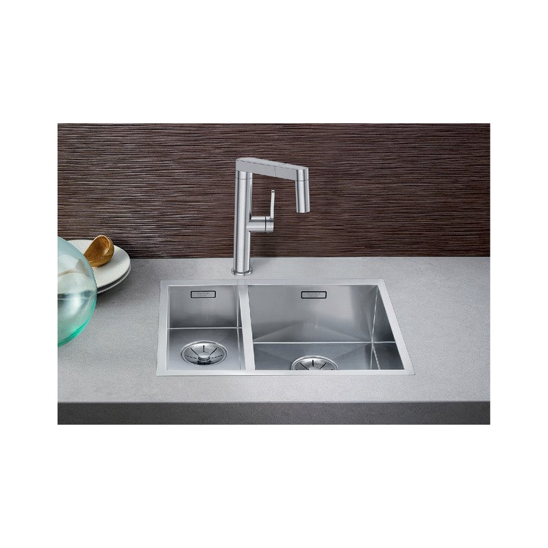 Il Lavello Blanco sottotop Andano 400/400-U finitura Acciaio Inox 18/10 è dotato di due vasche con piletta da 3½", sifone, tappo a cestello InFino® e kit di montaggio.