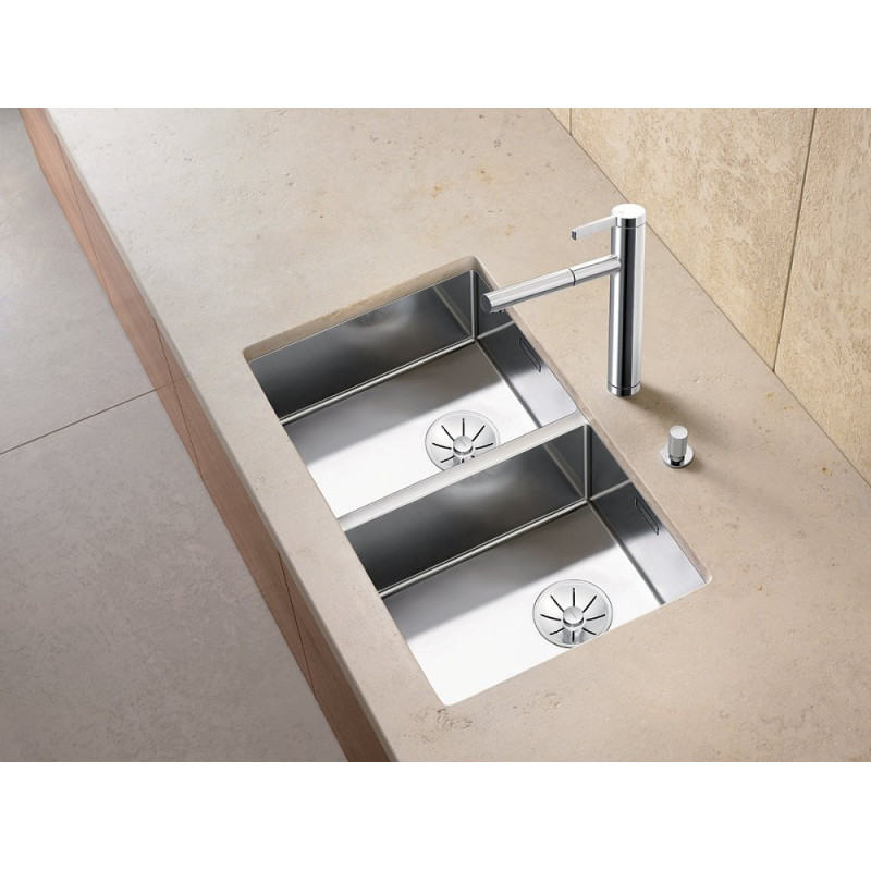 Il Lavello Blanco Dinas 8 finitura Acciaio Inox 18/10 è dotato di due vasche con piletta da 3½", sifone e tappo a cestello.