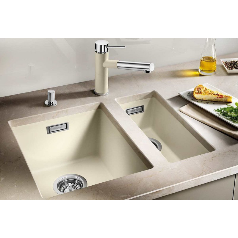 Il Lavello 1523168 Blanco Legra 8 S in SILGRANIT® PuraDur® è dotato di due vasche con piletta, sifone, tappo a cestello e gocciolatoio.